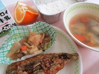 公開日 2026年02月03日 2月3日(火)節分給食 ごはん 牛乳 いわしのかば焼き 白菜のごましょうゆ和え けんちん汁 いよかん 節分にはいわしの頭「やいかがし」を飾ったり、いわしを食べる風習があります。