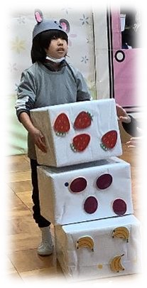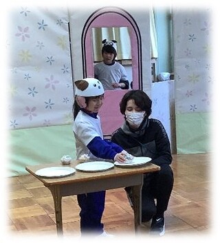 2月の参観会では、単元名を「とんとんとん。だれかしら?」と名付けて、学習発表会を行いました。絵本「だれかしら?」の話をベースにして、動物になった子どもたちが「とんとんとん。」とドアをノックする劇遊びです。ふんする動物は、12種類の中から自分で好きなものを選んで決めました。帽子に耳や目を自分で貼って衣装を作りました。劇の中では、子どもたちが今年度上手になった活動を披露しました。自分の出番を楽しんで、進んで取り組むことができました。
