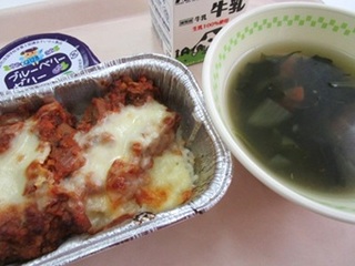 公開日 2026年02月17日 2月17日(火)の給食 手作りミートドリア 牛乳 ほうれん草スープ ブルーベリーゼリー 給食室手作りのミートドリアです。ごはんの上に給食室で作ったミートソースとチーズをのせてオーブンで焼いて作りました♪