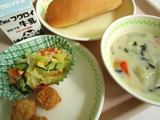 パン 牛乳 冬野菜のシチュー たらカリカリフライ ミモザサラダ