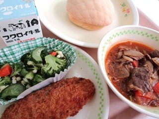 メロンパン 牛乳 ビーフストロガノフ サーモンフライ ブロッコリーサラダ