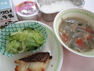 ごはん 牛乳 真鯛の塩焼き カレードレッシングサラダ 具だくさんとん汁