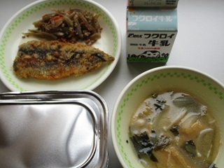 「ごはん、牛乳、いわしのかば焼き、五目きんぴら、みそ汁」