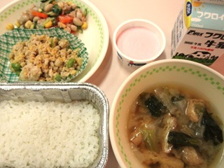 公開日 2026年04月20日 4月20日(月)入学・進級お祝いメニュー 「三食ごはん、牛乳、カラフルサラダ、みそ汁、静岡いちごのムース」 三色ごはんといちごのムースで、卵、枝豆、いちごのムースの色も華やかに入学、進級のお祝いです。