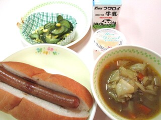 「ホットドック、牛乳、コーンサラダ、カレースープ、りんごゼリー」