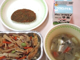 公開日 2026年04月27日 4月24日(金)ふるさと給食 「たけのこごはん、牛乳、黒はんぺんお茶フライ、豚汁」 毎月23日前後を「ふるさと給食の日」として県内産の食材を多く取り入れた給食を提供します。今月はたけのこ、黒はんぺん、お茶が県内産の食材です。