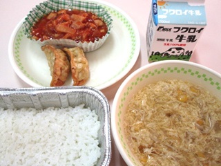 公開日 2026年04月28日 4月27日(月)の給食 「ごはん、牛乳、揚げぎょうざ、鶏肉のチリソース煮、中華風コーンスープ」 鶏肉のチリソース煮のチリソースは、調理室でトマトケチャップを使用して作りました。