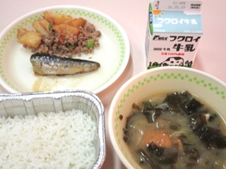公開日 2026年04月28日 4月28日(火) 「ごはん、牛乳、いわしのしょうが煮、じゃがいものそぼろ和え、みそ汁」 じゃがいものそぼろ和えのじゃがいもは油で揚げてから、しょうが入りの甘辛い豚肉のそぼろあんと和えてあります。
