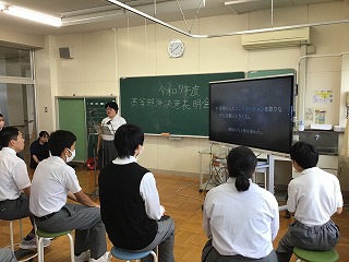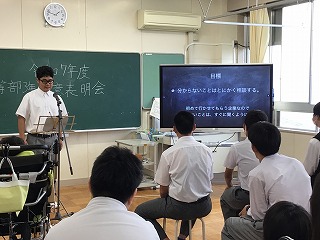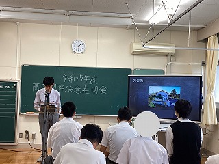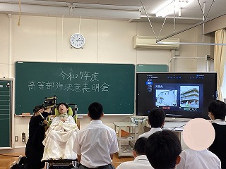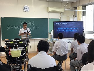 公開日 2025年06月13日 第1回職場実習に向けて決意表明会を行いました。 生徒たちはBYOD(1人1台端末)を活用し、Keynoteで自作したスライドを使って発表に挑みました。実習先や希望した理由、実習での目標などについて、一人一人が堂々と決意を表明していました。 これから始まる実習への意気込みと成長への期待が感じられました。