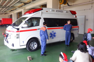 消防車や救急車の乗車体験では、わくわくした顔や心配そうな顔で実際に乗車してみたり、友達が乗車するのを見ていたりしました。乗車した子はみんな嬉しそうな表情で降りていきました。貴重な体験となる校外学習でした。