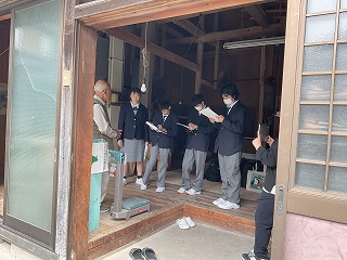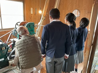 まず、訪れたのは地域の伝統食である須山うどんを製造している渡邉製麺さん。機械を動かしながら、うどんができるまでの工程を丁寧に説明してくださいました。見学やインタビューでは、生徒たちから「須山うどんを作るために朝早くから働いていることを知り、大変さを感じた。」や「こだわりをもって作っていることが分かった。」などの感想が聞かれました。