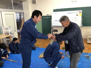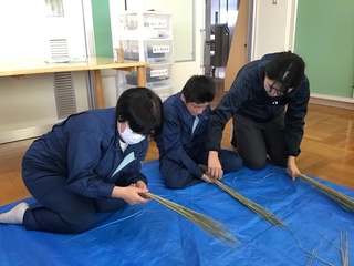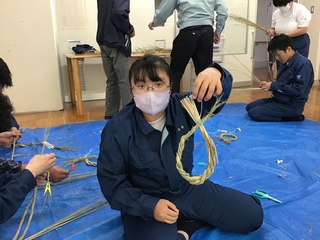 「一人できるようになると、周りの仲間に教えられるようになって、みんなでどんどん上達するんだよ。」という三井先生の言葉通り、昨年の経験がある3年生を中心に、やり方やコツを教え合う姿が見られました。稲わらのよい香りに包まれた教室で、生徒たちは伝統文化に親しみ、お飾り製作の充実感や達成感を味わうことができました。