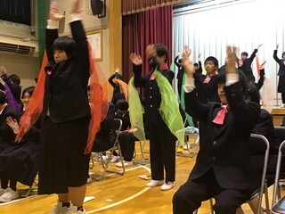続いて、ボディパーカッション「カルメン前奏曲」を披露しました。生徒達は2つのパートに分かれ、ひとつのグループは椅子に座って足踏みや手拍子でリズムを刻みました。もう一方のグループは、ミュージックスカーフを付けて華やかにパフォーマンスし、腕を大きく回したり、隊形移動したりして、ダイナミックで迫力ある動きを見せてくれました。