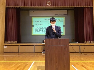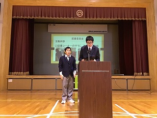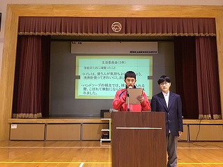 2月4日(水)学部集会で、後期委員会の活動報告が行われました。今回の集会は、「仲間の委員会活動の様子や成果を知ること」「来年度の委員会活動を選ぶ際の参考にすること」を目的としています。