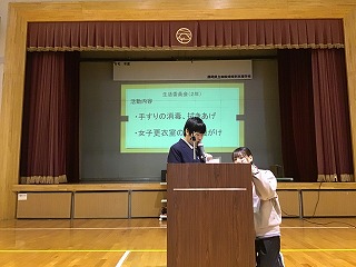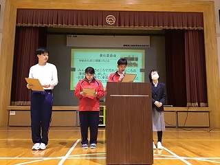 各委員会からは、後期に取り組んできた活動内容や、学校のために工夫しながらがんばってきたことが報告されました。生徒からは、「他の委員会がどんな活動をしているのか分かってよかった。」「学校のためにそれぞれが役割をもってがんばっていることが分かった。」「来年度どの委員会に入るか、よく考えたい。」といった声が聞かれました。