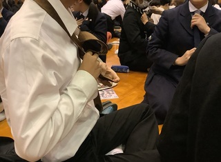 最後は「ネクタイの結び方講座」となりました。着用練習を行いましたが、講師からの説明を受けたあと、女子生徒は普段からネクタイをしているため、男子のサポートもしてくれました。