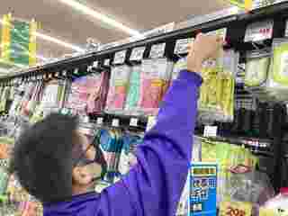SMさんは、杏林堂薬局姫街道店に行きました。日用品の品出しや前出し(商品を取りやすいように手前に出す仕事)、レジの見学をさせていただきました。洗剤やスポンジには様々な種類があることや、レジカウンターの中には割り箸などがあり、お客さんの要望に応じて渡せるようになっていることを学びました。