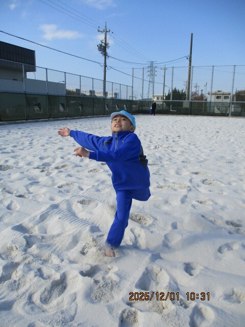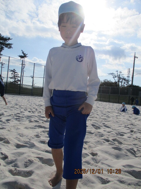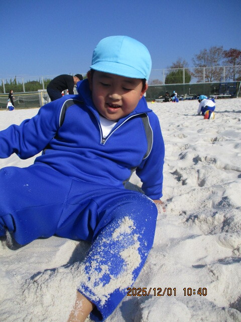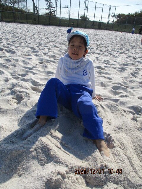 公開日 2025年12月23日 12月(がつ)1日(にち)にビーチコートに行(い)きました。前回(ぜんかい)は雨(あめ)のため、ビーチコートに向(む)かう途中(とちゅう)で学校(がっこう)に帰(かえ)ってくることになってしまいましたが…今回(こんかい)は、とてもいい天気(てんき)!サラサラで冷(つめ)たいビーチコートの砂(すな)の上(うえ)を走(はし)ったり、体(からだ)を埋(う)めたりと、砂(すな)の感触(かんしょく)を全身(ぜんしん)で楽(たの)しみながら遊(あそ)ぶことができました。