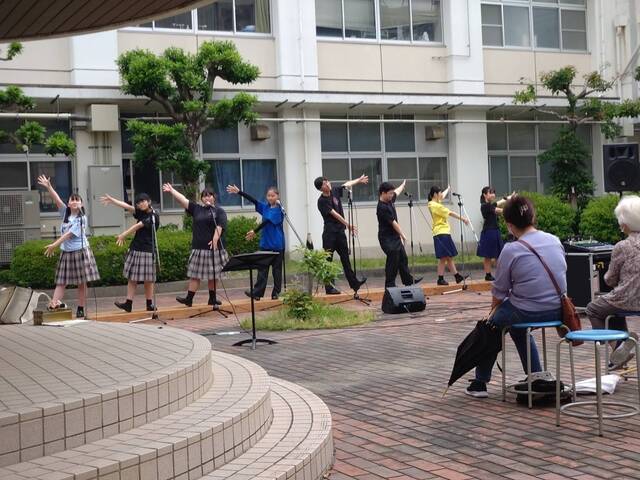 6月7日(土)の輝潮祭で、合唱部が中庭でコンサートを行いました。新入部員が加入してくれて初めてのコンサートに緊張している様子が見られましたが、お客様に良い音楽を届けようと一生懸命歌っていました。