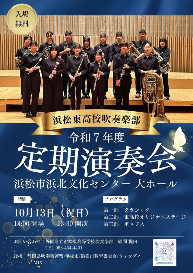 公開日 2025年09月30日 令和7年度定期演奏会のお知らせ 日時:2025年10月13日(スポーツの日) 開場:13:00 開演13:30 会場:浜松市浜北文化センター 大ホール (浜名区貴布祢291-1)