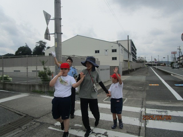 公開日 2025年06月12日 6月9日(月)に交通安全教室を行いました。 事前に、交通ルールについてのDVDを見たり、交通安全指導員の方の話を聞いたりしてから、学校周辺の歩道をクラスごとに歩きました。 道を渡るときには、一度立ち止まって手を挙げ、左右から自動車や自転車などが走ってこないか安全確認をすることが大切だと改めて学習しました。 グラスごとに行った歩行訓練でも、安全確認をしながら、落ち着いて歩くことができました。