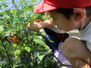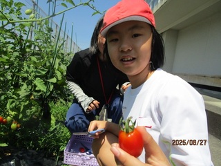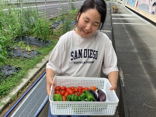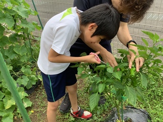 公開日 2025年07月24日 小学部5年生は、体育館横の道路沿いの畑で、夏野菜を育てています。5月にトマト、ナス、ピーマンの苗を植え付けて、水遣りをして成長を見守ってきました。6月下旬からは、収穫ができるようになりました。つややかな野菜が実っているのを見て歓声をあげ、大きな実や色づいた実を選んで収穫しました。