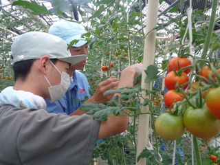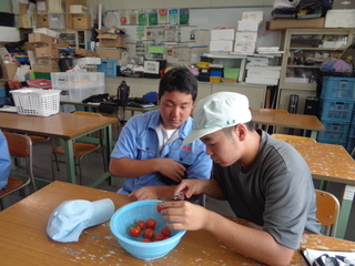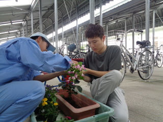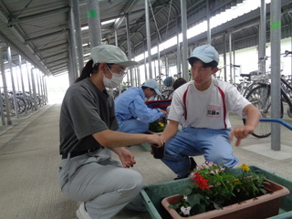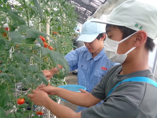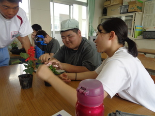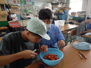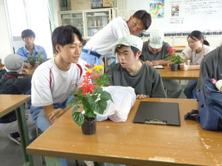7月3日(木)に高等部農園芸班の代表生徒11人が浜松湖北高校の産業マネジメント1科(農業)の生徒12人と交流しました。草花グループでは、2、3人のグループで、マリーゴールド、日日草、サルビア、トレビア、ジニアなどの苗を使って、プランターに寄せ植えをしました。浜松湖北高校の生徒と協力して素敵な寄せ植えを完成させることができました。その後、教室で花の名前や花を育てるコツなどについて、質問したり話を聞いたりしました。野菜グループでは、トマトの収穫や剪定を、浜松湖北高校の生徒と2人1組になり、協力し合いながら取り組むことができました。また、トマトの手入れや特徴について教えてもらいました。トマトの試食もし、本校の生徒は「甘くておいしいです。」とその味に驚いていました。今回の経験を今後の農園芸班の活動に活かしていきます。