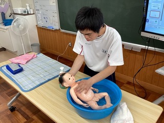 乳幼児に関する学習では赤ちゃん人形を沐浴させたり、ベビーカーに乗せて校内散策をしたりしました。赤ちゃん人形を優しく抱き上げてあやす生徒もいました。「あかちゃん、小さいね。」「やさしく、そっと抱っこですね。」と気付いたことを発表することができました。