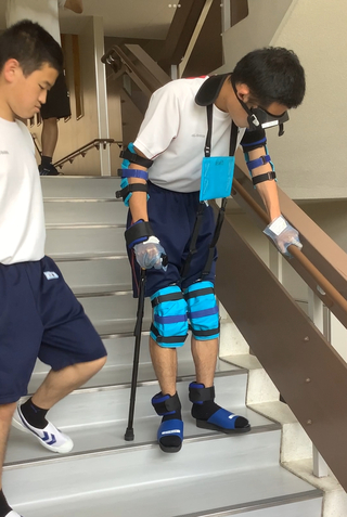 高齢者に関する学習では「高齢者疑似体験セット」を身に付けて校内を歩いたり、階段の昇り降りをしたりしました。生徒から、「足元が見えづらいと感じました。」「体を動かすのがたいへんでした。」という感想が出されました。また、グループでの話し合いでは、近くで見守ることや必要に応じて介助することが大切だということに気付き、その後の学習で実践することができました。
