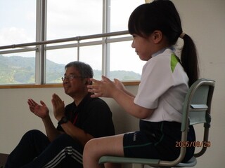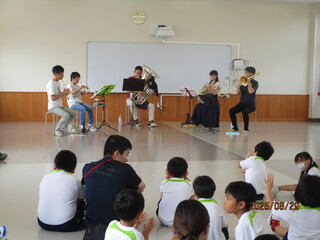 公開日 2025年09月02日 8月29日(金)に金管アンサンブルMIBRASSさんによる金管五重奏ミニコンサートがあり、1年生と2年が参加しました。 トランペットやチューバ、ホルン等の楽器から奏でられる音楽に合わせて手拍子をしました。素敵な演奏を聴いて幸せな気持ちになりました。 最後に「さんぽ」の演奏に合わせて、教室の中を歩きました。