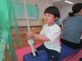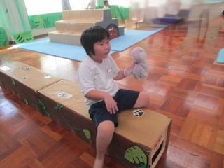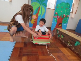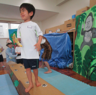 9月の遊びの指導は、ジャングルをテーマにして、様々な遊び方で遊ぶ授業を行っています。遊びの先導者ターザンと一緒にたくさん遊びました。