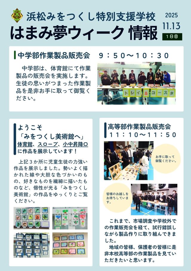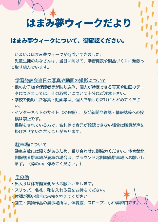 公開日 2025年11月07日 はまみ夢ウィークについて、以下の3つを掲載させていただきます。 学習発表の本番間近になり、児童生徒の皆さんの気持ちも高まってきました。 ご確認、よろしくお願いいたします。 はまみ夢ウィークだより[JPG:105KB] はまみ夢ウィーク情報[JPG:133KB] R7 はまみ夢ウィーク保護者駐車案内[PDF:223KB]