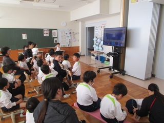 公開日 2025年11月19日 先日14日(金)に行ったはまみ夢ウィーク小学部ステージ発表の振り返りを行いました。みんなで発表の動画を見て頑張りを認め合いました。体操やダンスの曲が流れると自然に体が動きました。 最後におさるさんから頑張り賞のカードをもらうことができました。 自分だけのカードをもらって嬉しそうでした。