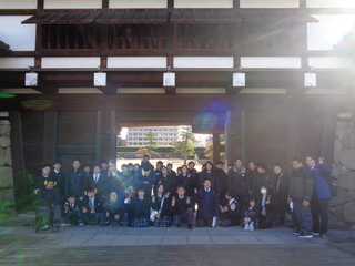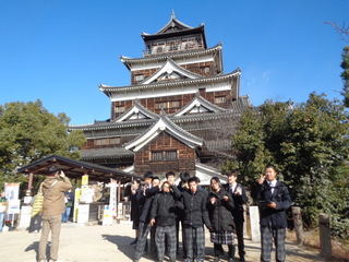 バスに乗って広島城に行きました。天守閣に行ったグループは、急な階段を登り、広島市内の景色を一望しました。二の丸を見学したグループは、むき出しになった天井や狭間(敵を攻撃するために設けられた壁の穴)を見つけ、建造物から歴史を体感しました。昼食はお好み焼きを食べ、広島県の魅力を五感で楽しみながら、学びを深めることができました。