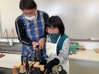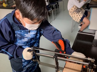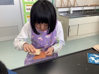 作業体験では、木工班で行うのこぎりとやすりの体験をしました。これまでお世話になった下級生への感謝の気持ちを込めて、下駄箱に置くクラスプレート作りに取り組みました。