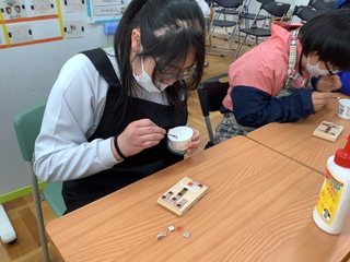タイルにボンドを付けて、丁寧に貼っていくよ。