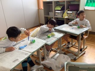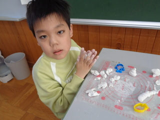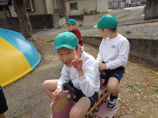 一列に並んで公園まで歩き、友達と一緒に仲良く遊んだり、紙粘土で進級祝いのメダルを作ったりしました。
