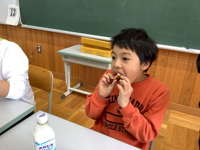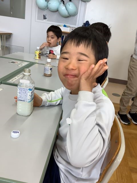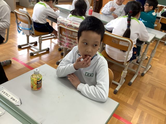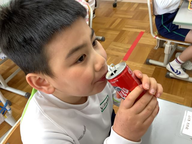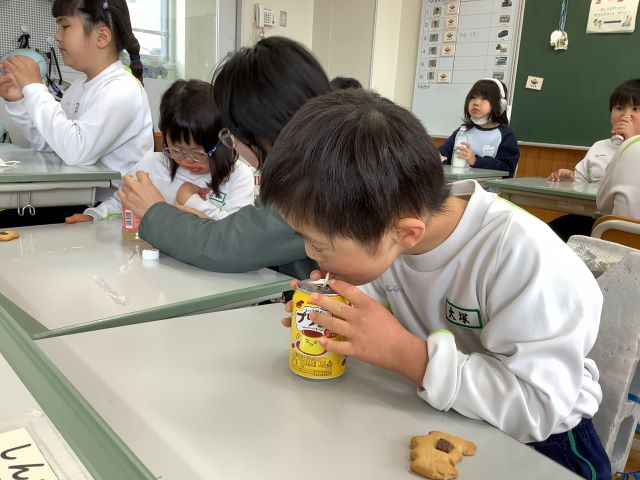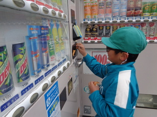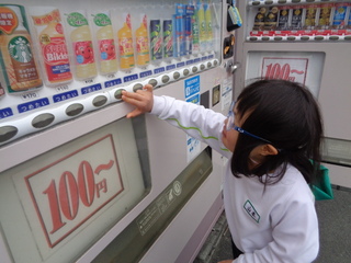 単元の最後には、クッキーパーティーをしました。学校の前にある自動販売機へ行って、自分たちで飲み物を買って来ることができました。