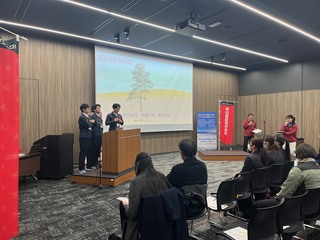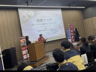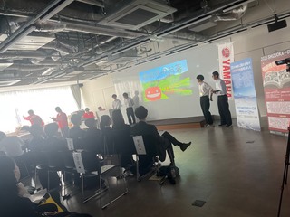 プレゼン前もここまで伴奏してくださった企業様の熱い声援に後押しされ、100人以上の観客を前に、緊張しながらも堂々とした発表でした。コンテスト終了後は各企業の皆様からこれまでの頑張りをほめていただきました。本当に生徒にとっても貴重な経験ができたと実感しています。