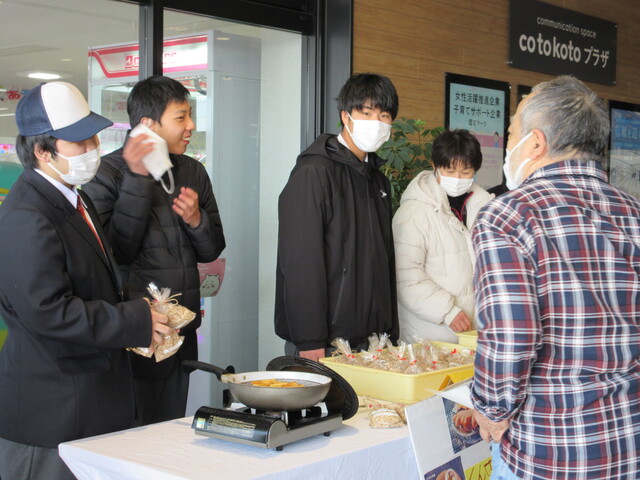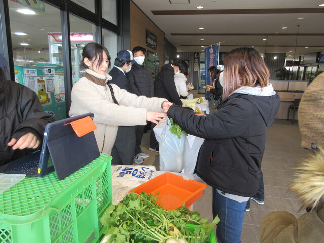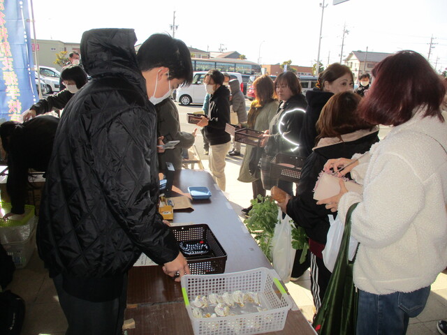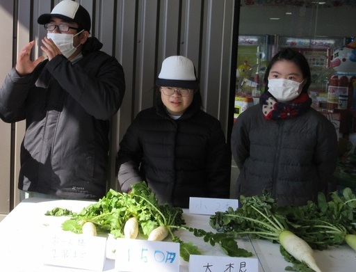 農耕班は安心安全な野菜を目指して、無農薬で育てています。合同販売会では、大根、じゃがいも、水菜、ほうれん草、ブロッコリー、スティックセニョールを販売しました。当日は大盛況で、用意した全ての野菜が完売しました。学校がある新居地区の方にもたくさん買っていただき、とても良い経験になりました。