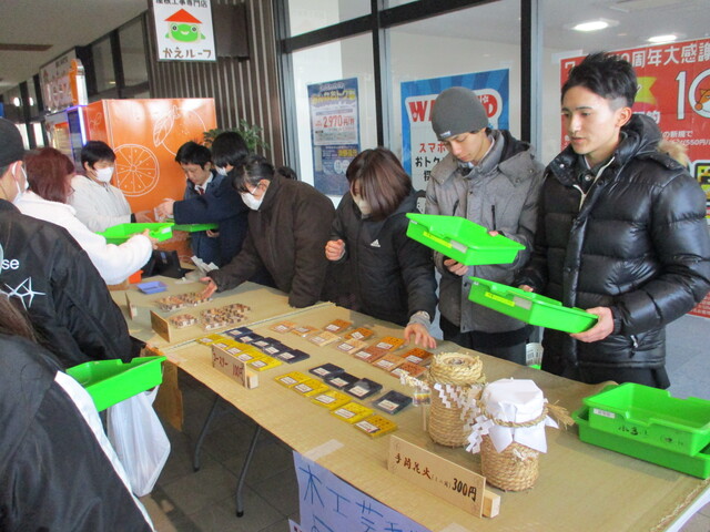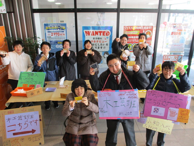 販売会の始めは皆、緊張している様子でしたが、徐々に生徒たちから「いらっしゃいませー!」「コースターいかがですか?」と元気に呼び込みをしたり、笑顔で製品の紹介をしたりすることができました。製品を完売することができ、達成感に満ちあふれていた木工芸班でした。