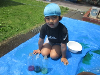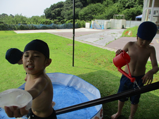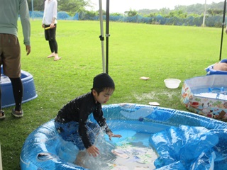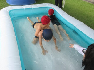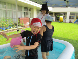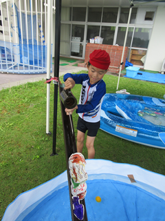 公開日 2025年07月17日 1,2年 生活単元学習「おみずランドであそぼう!」~水遊び~ 中庭におみずランドができました。大きなプールで友達と一緒にワニ歩きをしたり、魚すくいコーナーで自分たちで作った魚をといに流して遊んだりしました。色水コーナーではきれいな色水を作りました。好きなコーナーでたくさん水に触れながら、ひんやりと冷たい水の心地よさを味わいました。