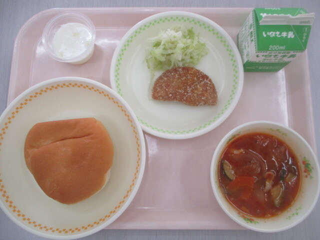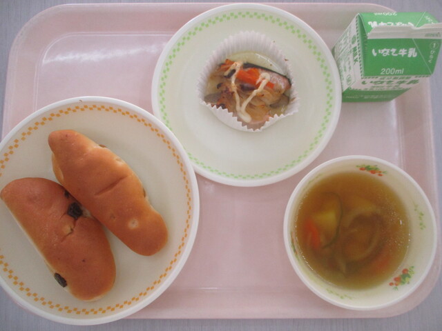 『ぶどうパンorりんごパン、鮭と野菜のカップ焼き、カレースープ、牛乳』