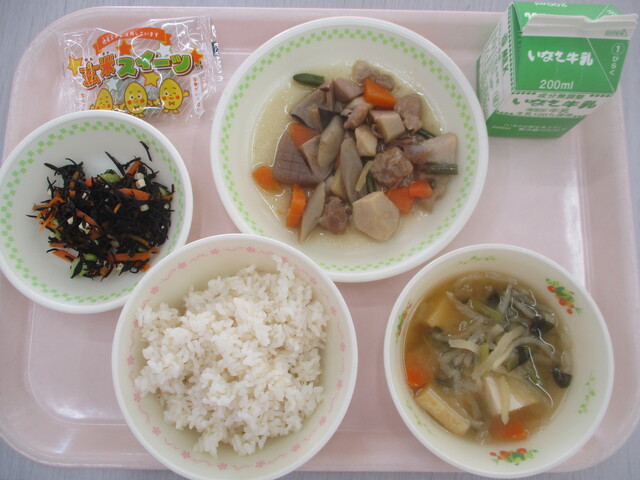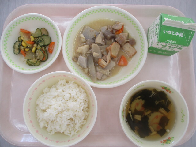 『ごはん、里芋の実だくさんみそ煮、冬瓜のごま酢和え、すまし汁、牛乳』