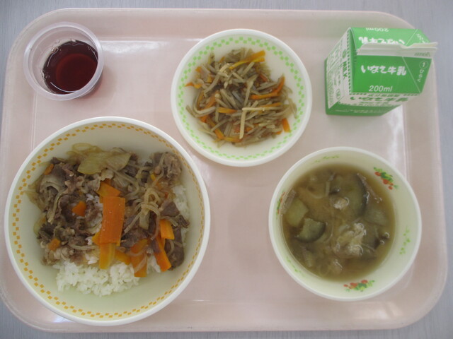 『牛丼、きんぴらごぼう、なすのみそ汁、ぶどうゼリー、牛乳』