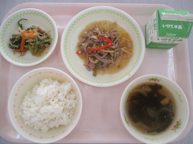 『ごはん、青椒肉絲、小松菜のナムル、わかめスープ、牛乳』