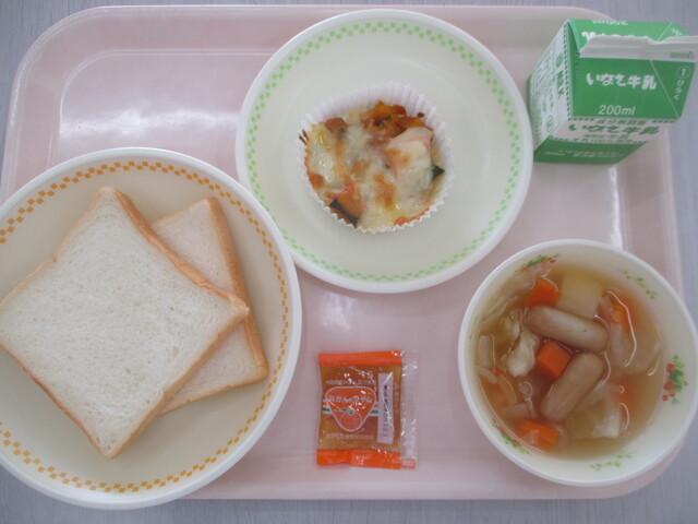 『食パン、みかんジャム、かぼちゃのグラタン、ウインナーのポトフ、牛乳』