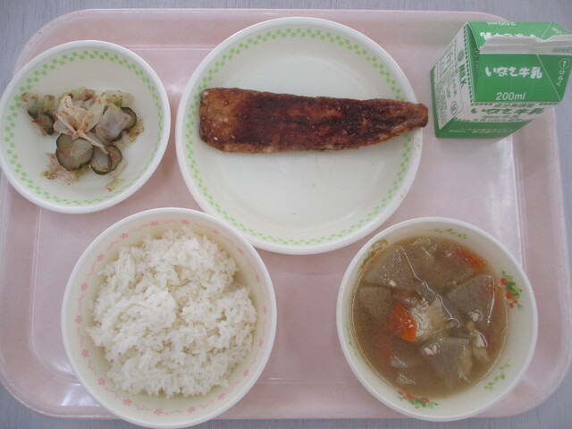 『ごはん、さんまのかば焼き、キャベツのカツオ梅和え、雷汁、牛乳』