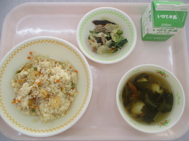 『エビチャーハン、野菜炒め、チンゲン菜とうずら卵のスープ、牛乳』