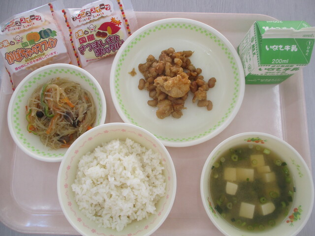 『ごはん、鶏肉と大豆の揚げ煮、和風チャプチェ、あさりのみそ汁、さつまいもタルトorかぼちゃのケーキ、牛乳』